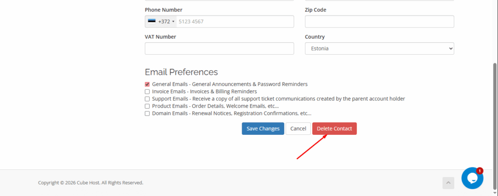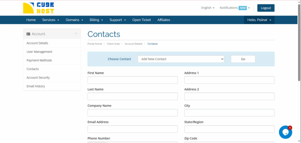 В разделе «Контакты» вы можете добавлять дополнительных пользователей в свою учетную запись Cube-Host и назначать им различные права доступа.