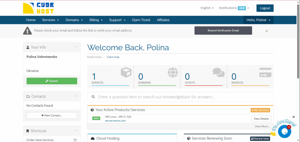 • Услуги — список активных услуг и VPS