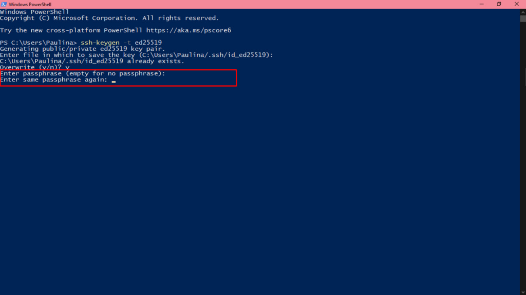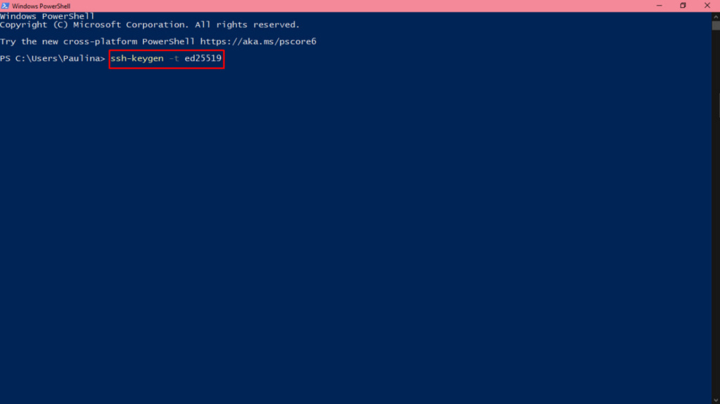 В открывшемся PowerShell выполните команду: ssh-keygen -t ed25519