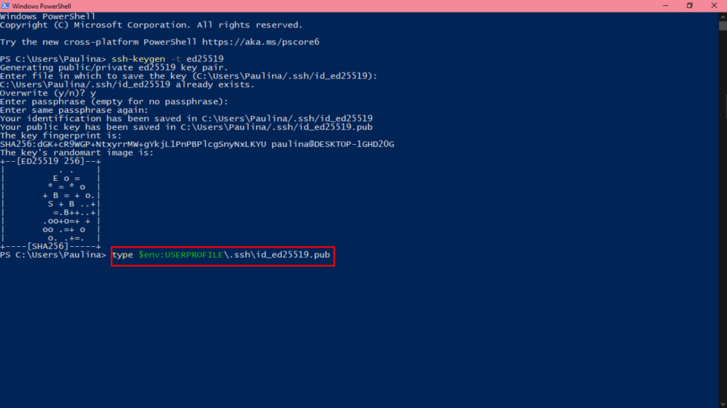 Чтобы отобразить открытый ключ, выполните команду: введите $env:USERPROFILE.sshid_ed25519.pub