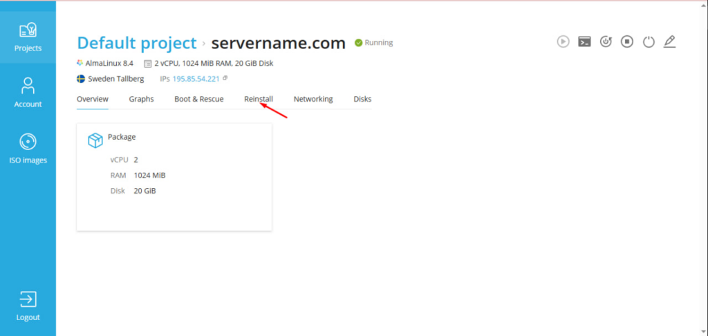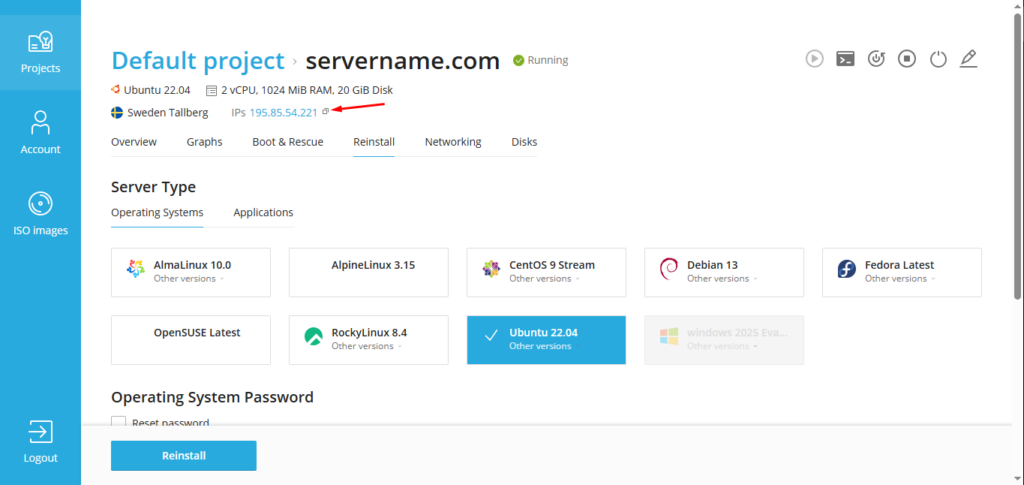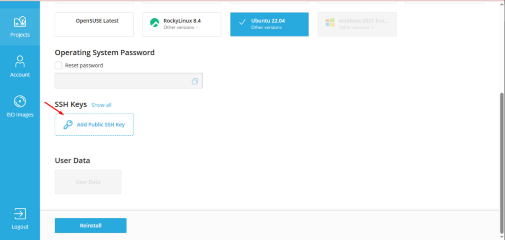 ВАЖНО: Ключ SSH добавляется при переустановке сервера. Если сервер уже развернут, необходимо выполнить переустановку, чтобы применить ключ.