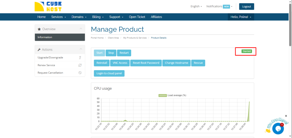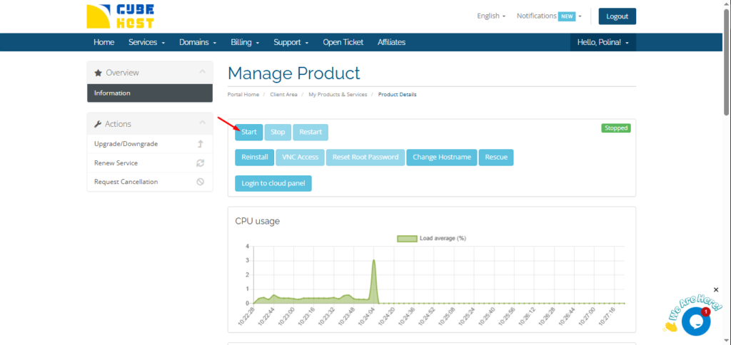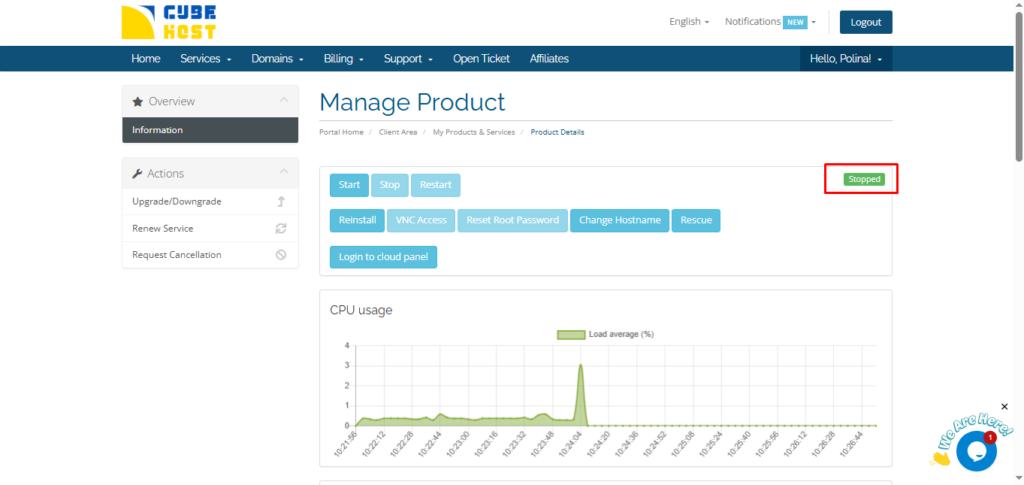 В панели управления Cube-Host вы можете полностью остановить сервер (выключить его) или перезапустить его всего за несколько кликов.
