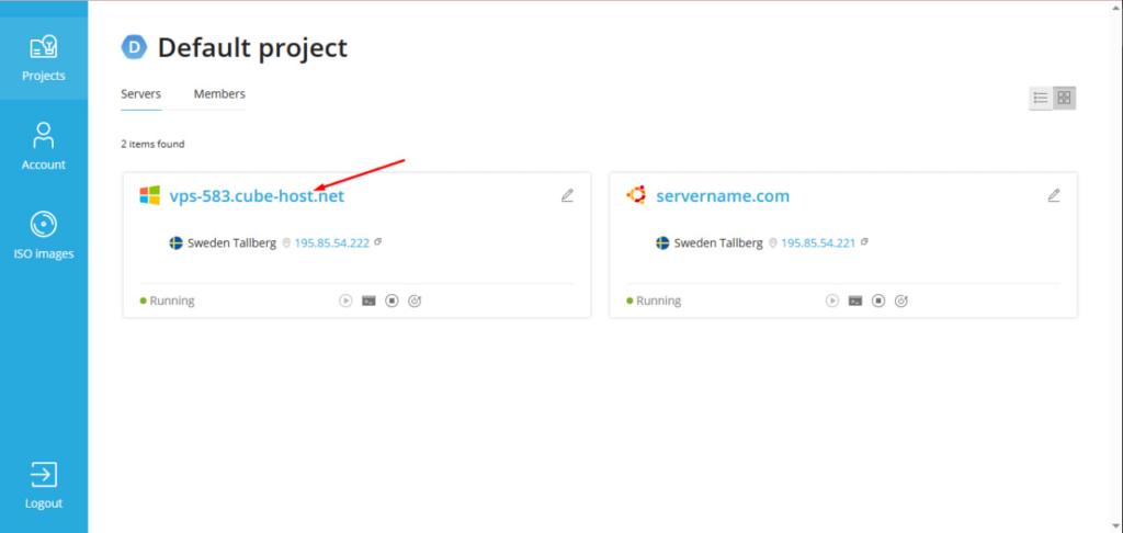 Затем нажмите на свой сервер (например, vps-583.cube-host.net).
