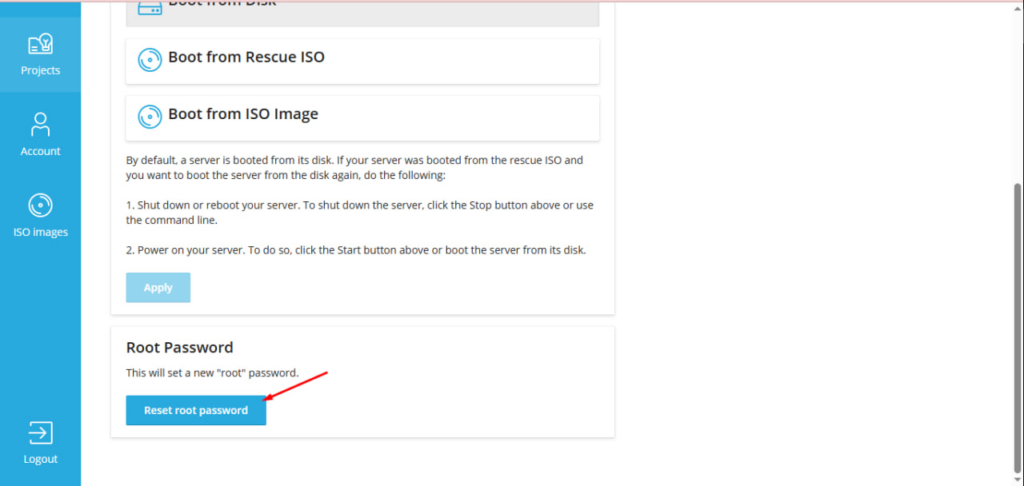 В блоке «Пароль root» нажмите «Сбросить пароль root».