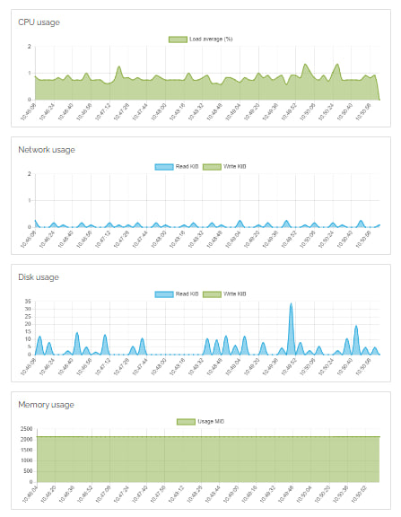 На странице «Управление продуктом» отображаются графики использования ресурсов сервера: